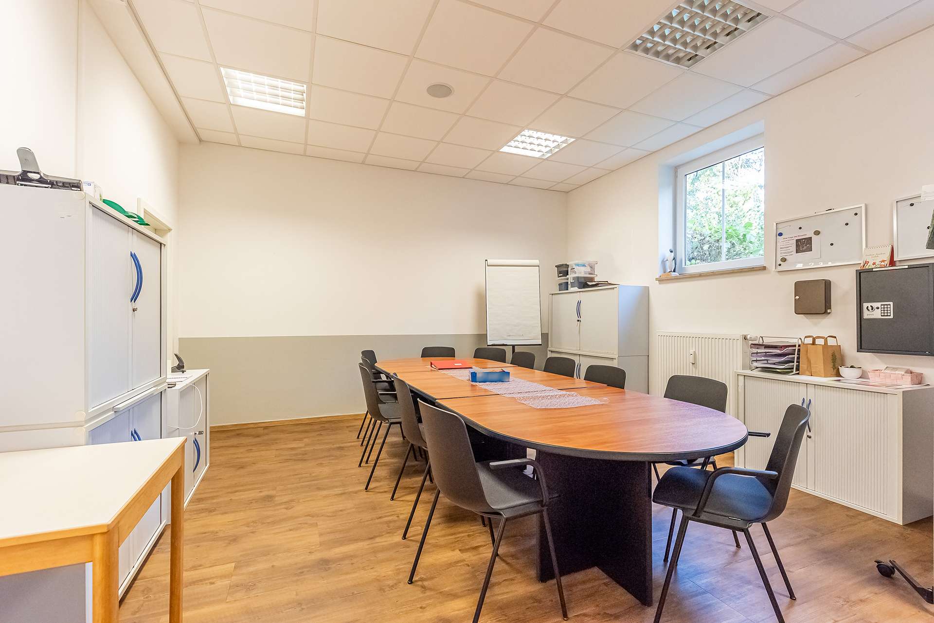 Das Objekt wurde in 2022 vollständig renoviert. Im Zuge dessen wurden die Decken und die Türen erneuert sowie die Wände neu gestrichen. Ebenso kam ein neuer Design-Vinyl-Bodenbelag. Die vorhandene Kitchenette kann kostenfrei von den Vormietern übernommen werden. Die vorhandene, praktische Raumaufteilung wurde durch die jetzigen Mieter vorgenommen. Ursprünglich handelte es sich bei der Einheit um eine vollständig offen gestaltete Gewerbefläche, siehe Grundriss. Bei jetziger Untergliederung der Räume wird die Einheit über eine geräumige Diele mit kleinem Wartebereich betreten. Zur Linken befinden sich zwei separate Räume, die als Büro genutzt werden. Im hinteren Bereich befinden sich ein geräumiger Konferenzraum mit Kitchenette, 2 Lagerräume und das WC. Die Raumaufteilung kann entweder übernommen werden oder durch die Vormieter wieder rückgebaut werden, sodass eine offen gehaltene Gesamtfläche entsteht.