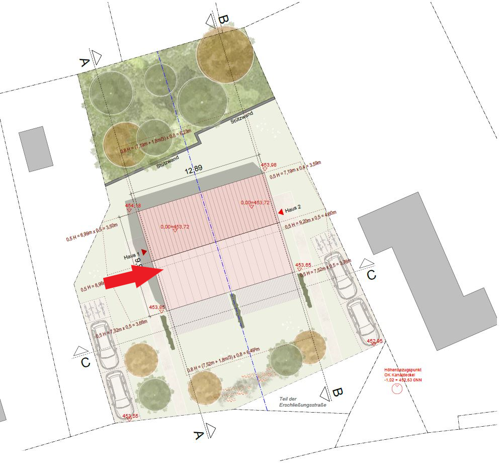 In attraktiver Lage des gefragten Freisinger Stadtteils Vötting freuen wir uns, Ihnen ein Baugrundstück mit hohem Potenzial präsentieren zu dürfen. Für das Grundstück liegt bereits ein genehmigter Vorbescheid vor, der die Bebauung mit einem modernen Doppelhaus vorsieht. Geplant ist ein Gebäude mit einer Länge von 12,89 m und einer Breite von 9,99 m. Die maximale Firsthöhe beträgt 9,32 m, die zulässige Wandhöhe 7,52 m. Damit eröffnet sich die Möglichkeit, eine Geschossfläche von rund 386,31 m² zu realisieren. Der umbaute Raum läge bei entsprechender Planung bei ca. 1.489 m³. Die architektonische Planung sieht eine Doppelhaushälfte mit Süd-West-Ausrichtung und ca. 140 m² Wohnfläche vor. Das Objekt würde sich mit 5 Zimmern über Erd-, Ober- und Dachgeschoss erstrecken und ist mit eigenem Garten sowie Balkon besonders familienfreundlich gestaltet. Zwei Stellplätze sorgen für eine komfortable Stellplatzlösung. Zudem ist ebenfalls ein genehmigter Vorbescheid für ein horizontales Zweifamilienhaus vorhanden. Dieses Ensemble bietet ideale Voraussetzungen, um ein hochwertiges Wohnprojekt in einem begehrten Umfeld zu verwirklichen. Weiterführende Unterlagen wie der Vorbescheid oder detaillierte Architektenpläne stellen wir Ihnen auf Anfrage gerne zur Verfügung.