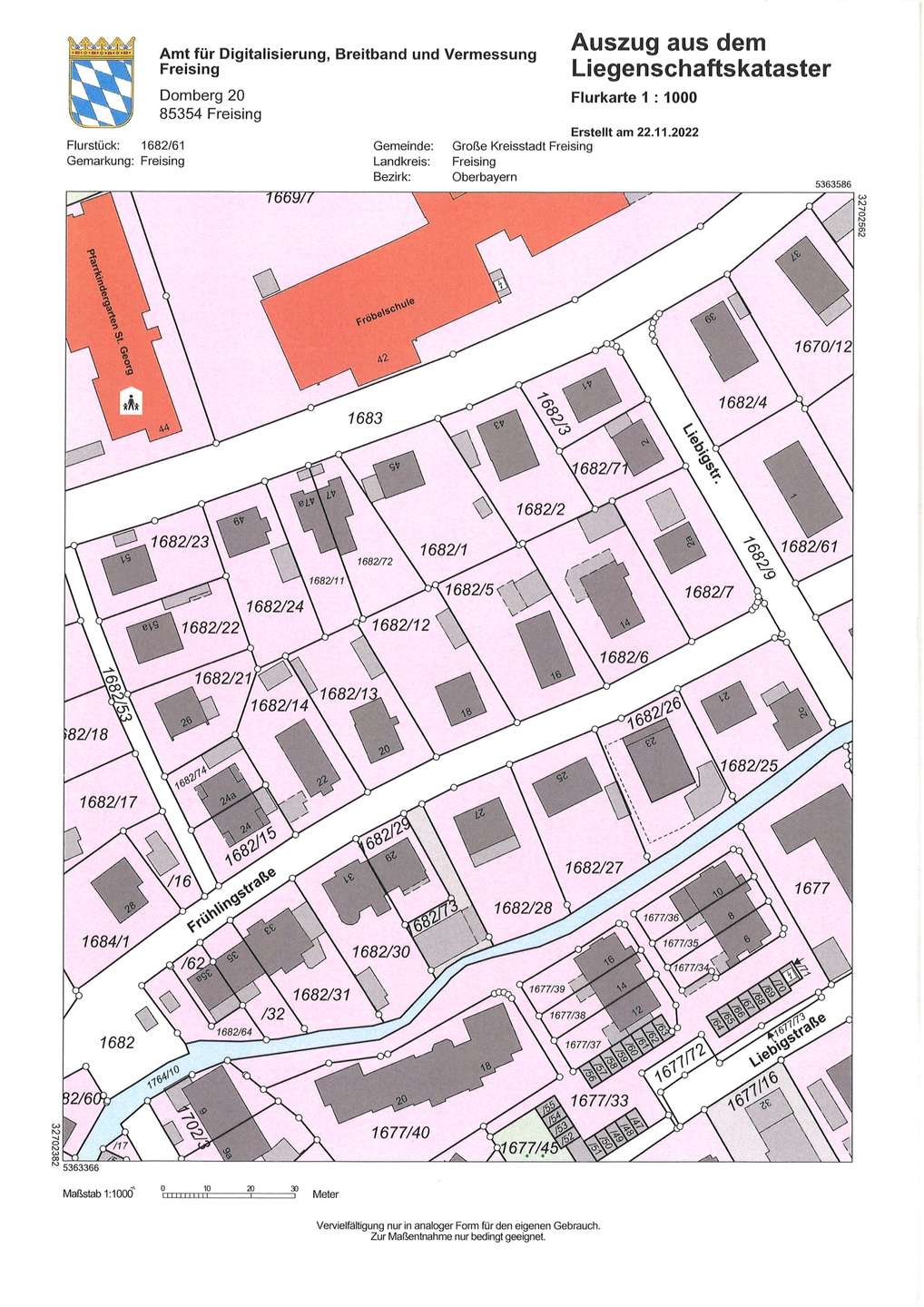 Das Grundstück ist rechteckig, ca. 18,5 m x 36 m und hat die Flurstücknummer 1682/7. Derzeit ist es mit einem sehr kleinen, sanierungsbedürftigen Einfamilienhaus mit Garagenanbau aus dem Baujahr 1951 bebaut, das abgerissen werden müßte. Es gibt hier keinen Bebauungsplan. Das Baurecht richtet sich nach der umliegenden Bebauung. Nach mündlicher Rücksprache mit dem Bauamt Freising kann man davon ausgehen, dass Sie hier ein sehr großes Einfamilienhaus oder 2 Doppelhaushälften bauen dürfen.