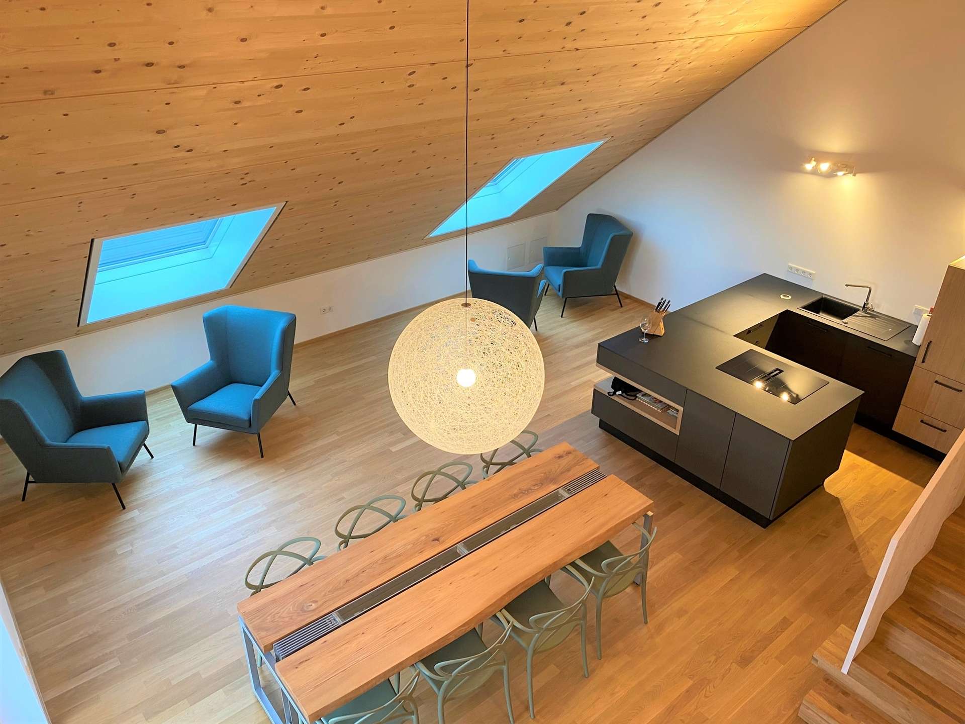 Bei diesem Angebot handelt es sich um eine "Luxus-Suite" in einer Wohngemeinschaft. Die WG kann über die Außentreppen im Laubengang oder den Fahrstuhl, der mit einem Schlüssel bedient werden kann und direkt in der Wohnung ankommt, erreicht werden. Über einen langen Flur vom offenen Wohn-, Ess- und Kochbereich aus, gelangt man zu dem abgeschlossenen Apartment. Dieses bietet auf ca. 40 m² einen Wohnraum, eine Schlafgalerie mit Treppe sowie ein separates Bad mit Dusche. Die Ausstattung lässt keine Wünsche offen: massives Eichenholzparkett, Hohlkastendecken, übergroße, elektrisch zu öffnende Dachflächenfenster, mediterrane Fliesen im Bad sowie Fußbodenheizung auf der gesamten Fläche. Zu diesem Apartment gehört außerdem der große Wohn-, Ess- und Kochbereich inkl. Elektrogeräten, ein weiteres Badezimmer sowie der Balkon. Dies kann, je nach Belieben, alleinig genutzt oder den anderen Bewohnern ebenfalls zur Mitbenutzung zur Verfügung gestellt werden.