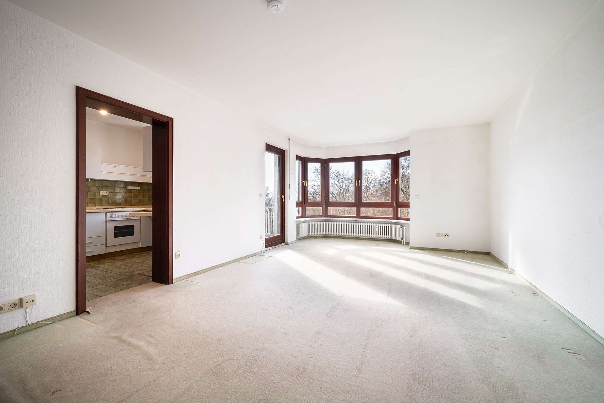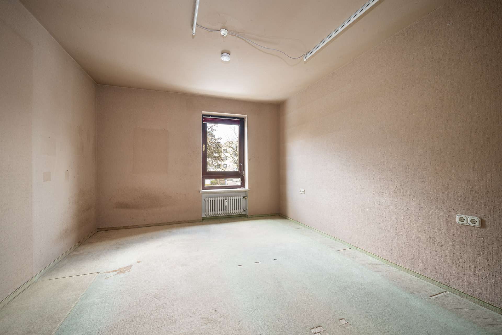 Die Wohnung befindet sich in einem renovierungsbedürftigen Zustand: Es sind größtenteils alte Teppichböden vorhanden. Badezimmer und Gäste-WC sind mit Fliesen aus dem Baujahr ausgestattet. Sämtliche Wände sind tapeziert.
